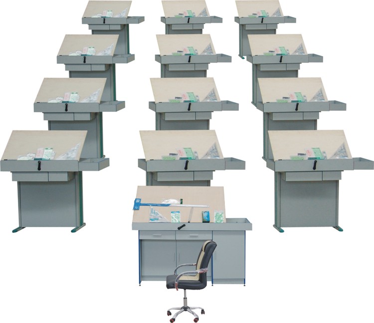 工程制圖是工程界的語(yǔ)言,工程制圖課程是理工科主要的技術(shù)基礎(chǔ)課,如何更快地培養(yǎng)學(xué)生的空間思維能力,更有效地掌握繪圖基本功,這是廣大師生多年愿望。 工程制圖實(shí)驗(yàn)室配套系列,可以創(chuàng)造一個(gè)要求的、清新的制圖環(huán)境與學(xué)習(xí)氣氛,有利于教學(xué)計(jì)劃的順利實(shí)施與教學(xué)質(zhì)量的提高。本系列包括學(xué)生制圖桌、教師演示臺(tái)、高亮度投影儀、活動(dòng)轉(zhuǎn)椅及教師桌。 工程其中學(xué)生制圖桌經(jīng)過(guò)多年的改進(jìn),具有實(shí)用方便配套齊全,輕巧大方堅(jiān)固耐用拆裝方便等特點(diǎn)。 每桌附有: 1.“基本形體”速成小模型一套,供建立投影概念的初始階段使用。 2.繪圖工具和儀器: a.一號(hào)圖板及相應(yīng)的一字尺裝置一套。 b.三角板(30厘米)一付、曲線板,比例尺,不銹鋼多用擦圖片各一付。 c.繪圖儀器(5件)、繪圖墨水筆(3支)各一盒。 d.常規(guī)與各種專(zhuān)業(yè)模板。 3.兩種制圖國(guó)家標(biāo)準(zhǔn)選用。
