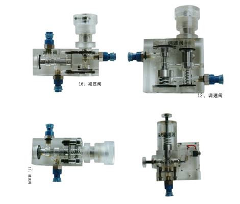 3、實訓(xùn)元件均為透明有機材料制成,便于了解掌握幾十種常用液壓元件的結(jié)構(gòu),性能及用途。掌握幾十種基本回路的工作原理,實驗組裝回路快捷、方便。